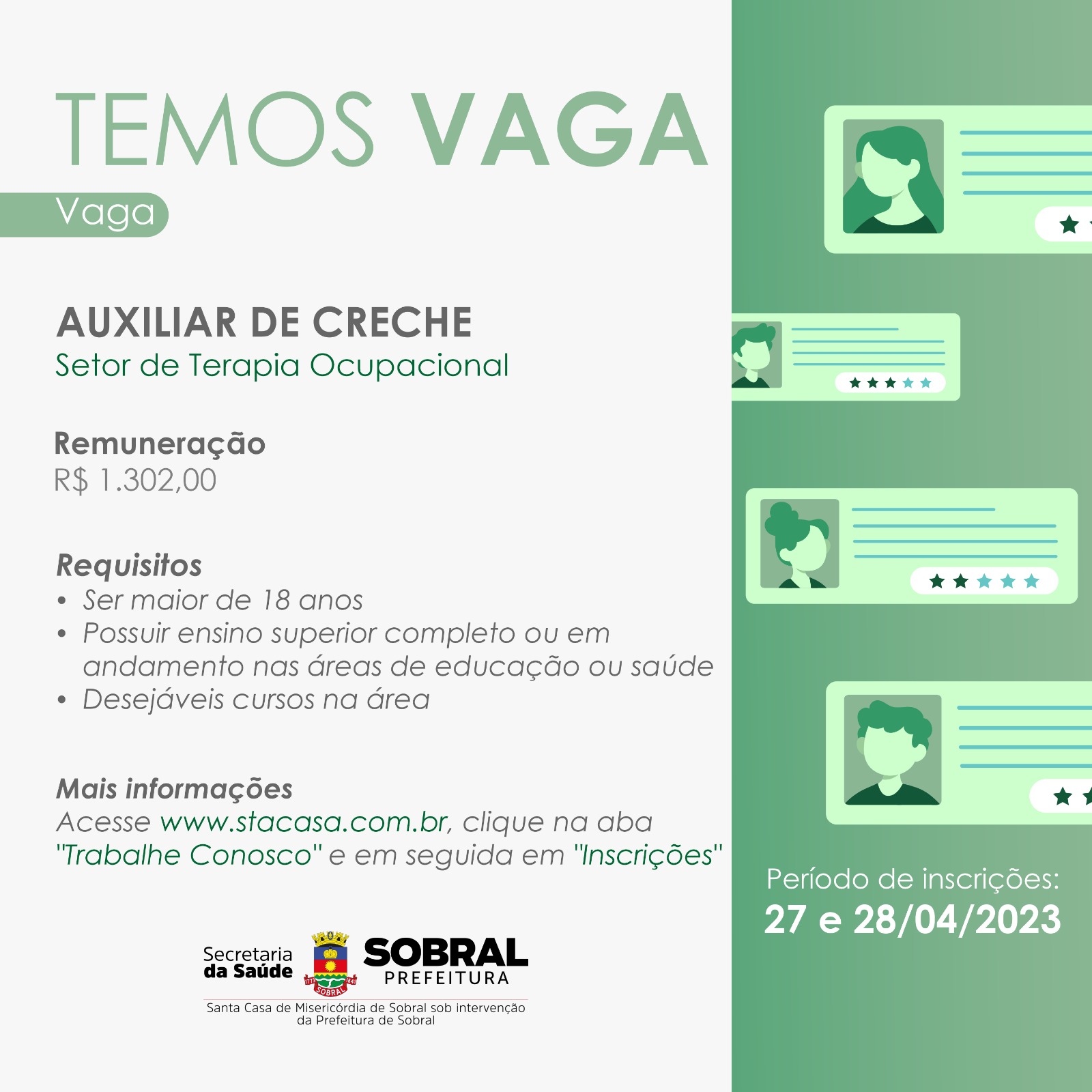 A Santa Casa de Misericórdia de Sobral lançou, nesta quarta-feira (26/04), o edital N°04/2023 do processo seletivo para auxiliar de creche para atuação no serviço de Terapia Ocupacional. As inscrições serão realizadas nos dias 27 e 28 de abril de 2023, no site www.stacasa.com.br na aba 'Trabalhe Conosco'.